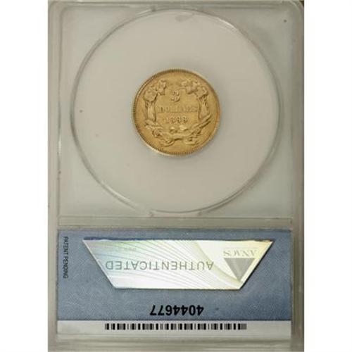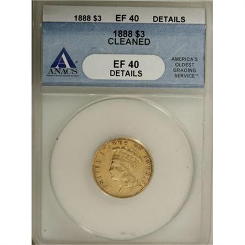 <B>1888 $3 --Cleaned--ANACS. XF40 Details. </B></I> Evenly worn with substantial design details remaining. The fields show faint hairlines, and a couple of tiny handling marks are evident immediately to the left of the date. Still attractive despite the old cleaning. <BR><BR><B>Coin Engraver:</B> James B. Longacre<BR><BR><b>Shipping:</b> Coins & Currency (<a target="_blank" href="http://www.heritageauctions.com/common/shipping.php">view shipping information</a>)
