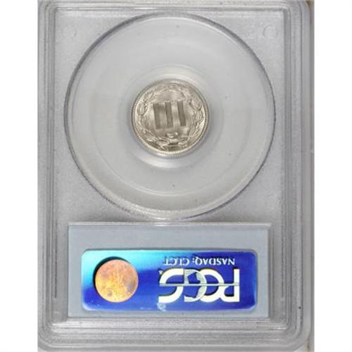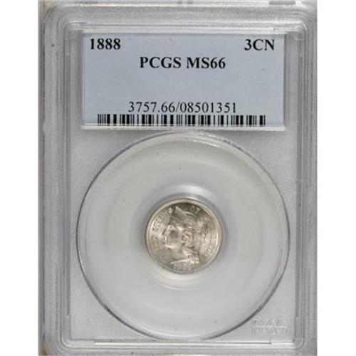 <B>1888 3CN MS66 PCGS.</B></I> A wispy peripheral die crack extends through 188 in the date. The design elements are boldly struck and the bright, satiny mint luster is unabated. Untoned and expertly preserved, with only the faintest of marks that deny perfection. Population: 58 in 66, 32 finer (8/07). <BR><BR><B>Coin Engraver:</B> James B. Longacre<BR><BR><b>Shipping:</b> Coins & Currency (<a target="_blank" href="http://www.heritageauctions.com/common/shipping.php">view shipping information</a>)