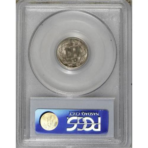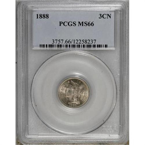 <B>1888 3CN MS66 PCGS.</B></I> The swirling luster of this late-date three cent nickel gives it an uncommon vibrancy for the issue. Hints of rose and green-gold add interest to the pleasingly preserved nickel-gray fields. Population: 59 in 66, 32 finer (1/08).<BR><BR><B>Coin Engraver:</B> James B. Longacre<BR><BR><b>Shipping:</b> Coins & Currency (<a target="_blank" href="http://www.heritageauctions.com/common/shipping.php">view shipping information</a>)