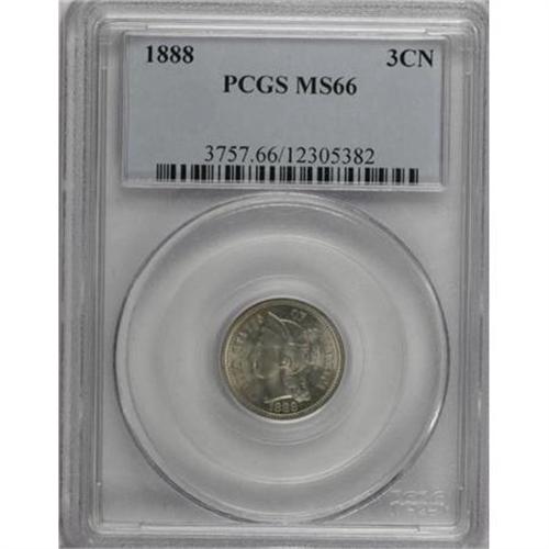 <B>1888 3CN MS66 PCGS.</B></I> Strongly lustrous with primarily nickel-white surfaces. This well-defined Premium Gem offers solid eye appeal and is a high-end survivor for its issue of only 36,501 pieces. Population: 62 in 66, 32 finer (3/08).<BR><BR><B>Coin Engraver:</B> James B. Longacre<BR><BR><b>Shipping:</b> Coins & Currency (<a target="_blank" href="http://www.heritageauctions.com/common/shipping.php">view shipping information</a>)