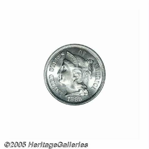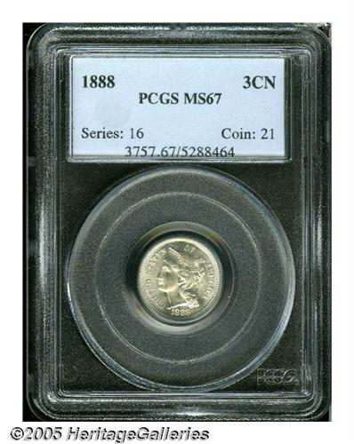 <B>1888<3CN> MS67 PCGS.</B></I> A luminous, well struck Superb Gem, untoned and seemingly pristine. A truly beautiful coin. One of the few business strike Three Cent Nickel issues to periodically surface in Superb condition, but still many times scarcer than similarly graded proofs. Population: 28 in 67, 1 finer (6/05).