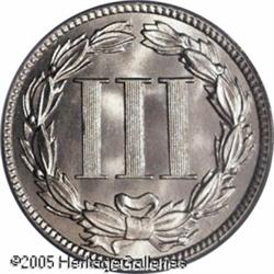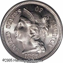 <B>1888 3CN  MS67 PCGS.</B></I> Both sides of this impeccably smooth example display supreme, satiny brilliance under a thin veil of speckled golden toning. The strike is well executed in all areas and is particularly sharp on the highpoints of the reverse. The 1888 is one of the best produced issues in the series and can be located without too much difficulty at the MS65 grade level. MS67s, of course, take on much greater significance. Population: 28 in 67, 1 finer (1/05).<BR><I>From the Bruce Scher #1 All-Time PCGS Registry Set.</B></I>   Lot:4022