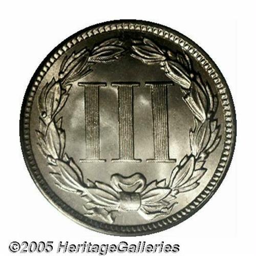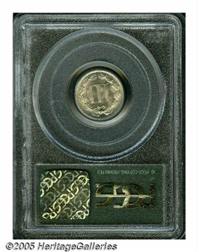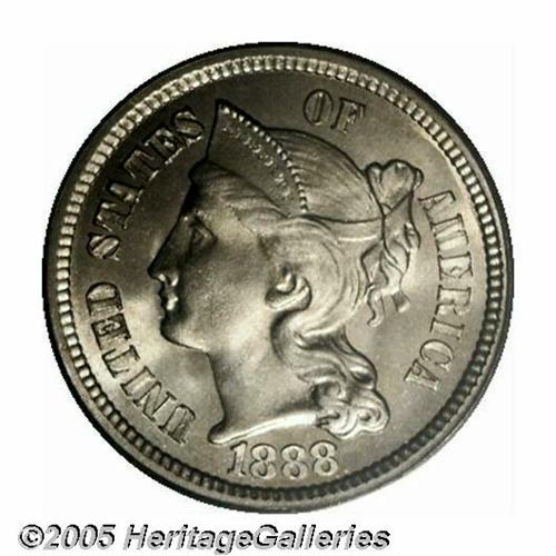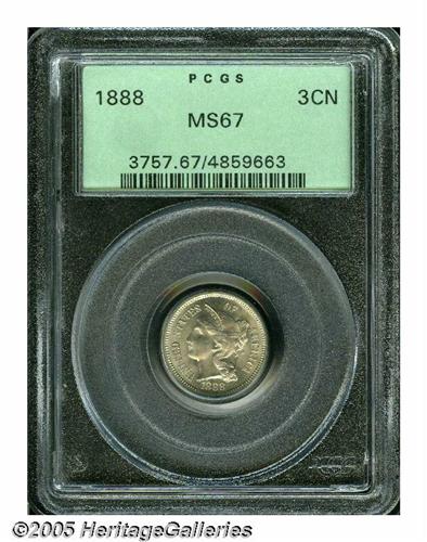 <B>1888<3CN> MS67 PCGS.</B></I> Both sides of this impeccably smooth example display supreme, satiny brilliance under a thin veil of pastel golden toning. The strike is well executed in all areas and is particularly sharp on the highpoints of the reverse. The 1888 is one of the best produced issues in the series and can be located without too much difficulty at the MS65 grade level. MS67s, of course, take on much greater significance. Population: 28 in 67, 1 finer (4/05).<BR><I>From The Western Hills Collection.</B></I>
