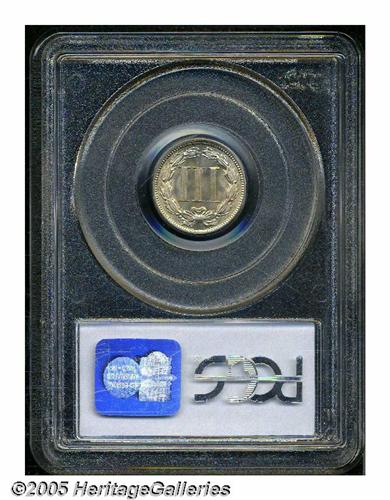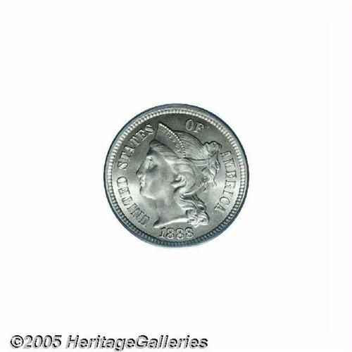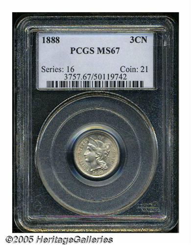 <B>1888<3CN> MS67 PCGS.</B></I> The 1888 is another low mintage entry in the series. Business strikes and proofs combined for only 41,083 pieces. While proofs regularly appear on the market, the business strikes are scarce in Mint State, and are rare at the MS67 level. This lustrous, meticulously struck, and nearly pristine Superb Gem offers blended golden-brown and lilac toning. The 8s in the date are recut within the loops. Population: 28 in 67, 1 finer (6/05).