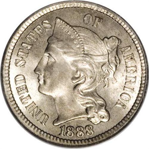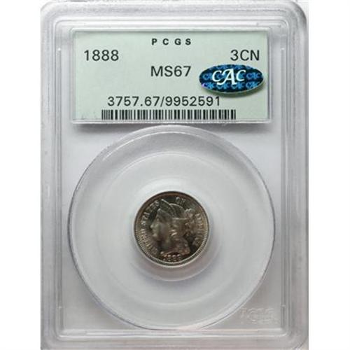 <B>1888 3CN MS67 PCGS. CAC.</B></I> An elegant and eminently appealing example of the penultimate three cent nickel business strike issue, which amounted to only 36,501 pieces. The shining and carefully preserved nickel-white surfaces show luminous peach elements across the portrait and within the wreath. PCGS has certified just one finer representative (12/07).<BR><BR><B>Coin Engraver:</B> James B. Longacre<BR><BR><b>Shipping:</b> Coins & Currency (<a target="_blank" href="http://www.heritageauctions.com/common/shipping.php">view shipping information</a>)