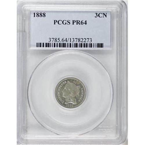<B>1888 3CN PR64 PCGS.</B></I> PCGS Population (343/573). NGC Census: (216/526). Mintage: 4,582. Numismedia Wsl. Price for NGC/PCGS coin in PR64: $320. (#3785)<BR><BR><B>Coin Engraver:</B> James B. Longacre<BR><BR><b>Shipping:</b> Coins & Currency (<a target="_blank" href="http://www.heritageauctions.com/common/shipping.php">view shipping information</a>)