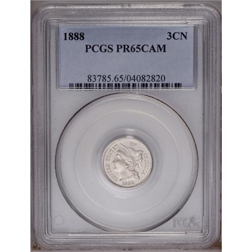 <B>1888<3CN> PR65 Cameo PCGS.</B></I> Excellent field to motif contrast, along with sharply struck design elements. Whispers of milky and light gold color run over both sides. A few light, inoffensive flecks are noted.
