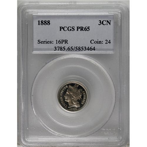 <B>1888 3CN PR65 PCGS.</B></I> Serious mint frost on the devices and highly reflective obverse fields argue for a Cameo designation; a bit of milkiness over the reverse argues against it. Still, a very attractive and well preserved Gem proof.<BR><BR><b>Shipping:</b> Coins & Currency (<a target="_blank" href="http://www.heritageauctions.com/common/shipping.php">view shipping information</a>)