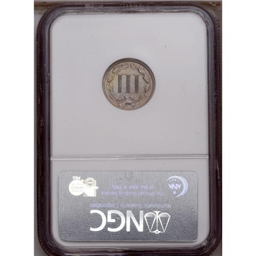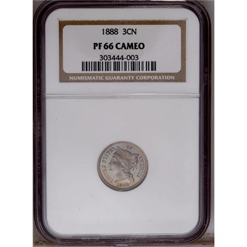 <B>1888<3CN> PR66 Cameo NGC.</B></I> The Cameo contrast is particularly outstanding when the coin is tilted beneath a light source. Subtle golden-orange, sky-blue, and lilac coloration adorns each side, which also reveal a few tiny flecks. The design features are well impressed, including sharp definition in the lines of the III. Census: 33 in 66, 7 finer (1/06).