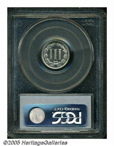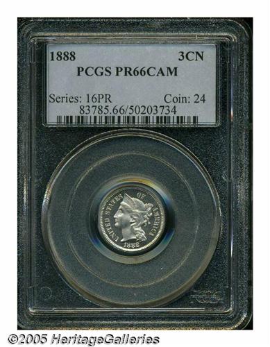 <B>1888<3CN> PR66 Cameo PCGS.</B></I> A nicely contrasted cameo proof that reveals just a hint of faint tan-gold color. The design features are exquisitely struck, including complete definition in the lines of the III. A couple of trivial, unobtrusive marks on Liberty's neck and cheek are mentioned for accuracy. Population: 30 in 66, 4 finer (4/05).
