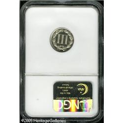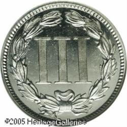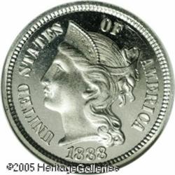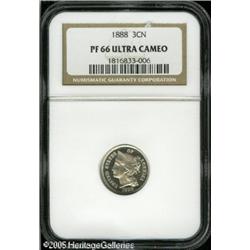 <B>1888 3CN PR66 Deep Cameo NGC.</B></I> Frosty design elements and highly reflective fields offer a pronounced cameo contrast. Touches of speckled milky toning are seen over the fields. No abrasions or carbon spots are evident, and the devices are well brought up. Population: 2 in 66, 0 finer in ultra cameo designation (1/05).<BR><I>From The Mike Jacobson Collection.</B></I> Lot:5770
