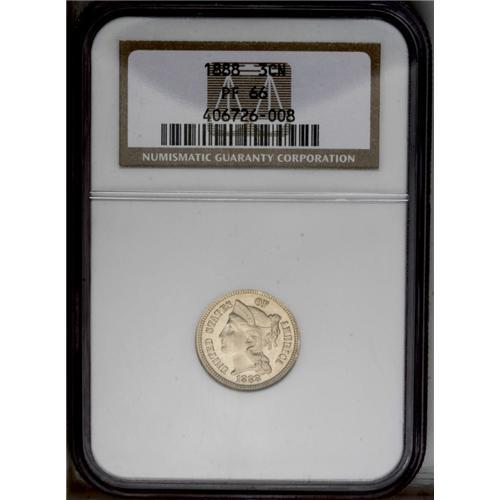 <B>1888<3CN> PR66 NGC.</B></I> Moderately mirrored with elegant gold and rose patina. A nicely detailed coin with all the hallmarks of careful preservation over the years. NGC has graded only 17 finer (7/06).
