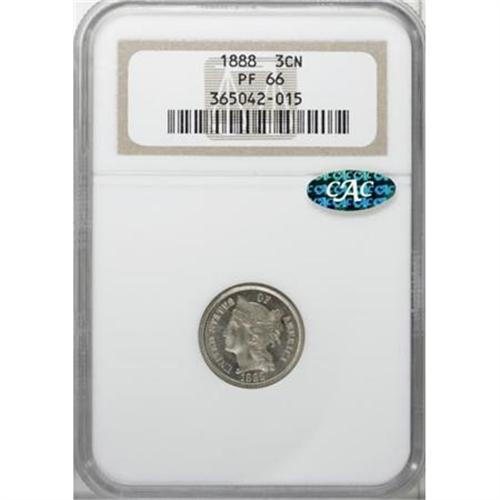 <B>1888 3CN PR66 NGC. CAC.</B></I> Well struck, frosted design elements stand out against the reflective fields, especially when the coin is turned slightly under a light source. Lightly toned surfaces are impeccably preserved.<BR><I>From The Southwest Collection.</B></I><BR><BR><B>Coin Engraver:</B> James B. Longacre<BR><BR><b>Shipping:</b> Coins & Currency (<a target="_blank" href="http://www.heritageauctions.com/common/shipping.php">view shipping information</a>)