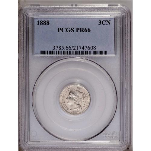 <B>1888<3CN> PR66 PCGS.</B></I> Fully brilliant and boasting shimmering, carbon-free surfaces that are especially radiant for the issue. When one compares many 20th century proofs with this long-extinct 19th century denomination, the older coins seem to represent outstanding value. <BR><BR><B>Important notice:</B> Heritage usually auctions material at the rate of 200-250 lots per hour. On some occasions eBay Live bid software or the Internet may not be able to keep up with the pace of the auction. We recommend placing a realistic absentee bid now as insurance to avoid disappointment. Occasionally the auctioneer may eliminate or reject an eBay Live bid, and the auctioneer may also reopen a lot after the close of the eBay live bidding (usually because we missed an audience bid), and may reject your bid even if it shows you as the winning bidder. By bidding via eBay Live, you agree that Heritage may award the lot to another bidder at its sole discretion under the circumstances described above or any other reasonable circumstances. Since eBay bids are not shown to us until we open the lot on the floor, we treat those bids just like floor bids. In most cases the floor responds before the eBay bid is presented to us, due to Internet lag time, so for consistency we have made it a policy that floor bids are always considered first over tie eBay live bids. Also please note that all Heritage lots purchased through eBay Live carry a 20% Buyer's Premium. Please make sure you read the Terms and Conditions before you bid. This lot is being auctioned in conjunction with a live floor auction by Heritage Galleries & Auctioneers. All final auction and invoice information will be supplied by Heritage Galleries & Auctioneers, and all other information should be considered preliminary. Lot:836 <BR><BR><B>Winning Notification and Billing:</B> After the FINAL session in this auction is complete, Heritage will send e-mail and snail mail invoices. This process normally takes several days. All final auction and invoice information will be supplied by Heritage Galleries & Auctioneers, and all other information should be considered preliminary. <BR><BR>This auction will be conducted on a live auction floor and over the Internet through eBay Live. If you choose to place an absentee bid, please take a moment to <font color='#0000ff'><u><a href='http://pages.ebay.com/liveauctions/help/before/laabsentee.html'>learn how eBay Live absentee bidding works</a></u></font><font color='#000000'>