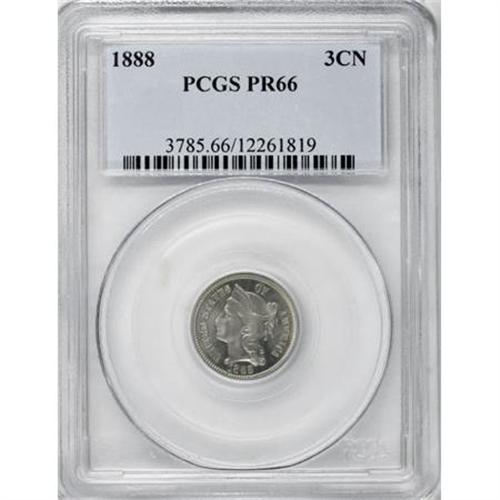 <B>1888 3CN PR66 PCGS.</B></I> Delicate pink and lavender tints visit the shining surfaces of this solidly struck Premium Gem. This beautifully preserved survivor offers incredible visual appeal for the grade. PCGS has certified 20 finer examples (12/07).<BR><I>From The John Stimson, Sr. Collection, Part One.</B></I><BR><BR><B>Coin Engraver:</B> James B. Longacre<BR><BR><b>Shipping:</b> Coins & Currency (<a target="_blank" href="http://www.heritageauctions.com/common/shipping.php">view shipping information</a>)