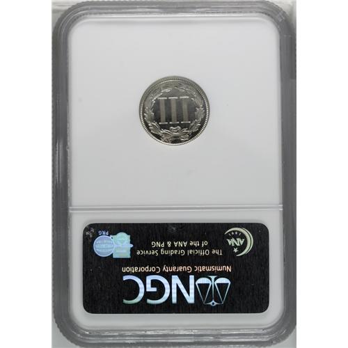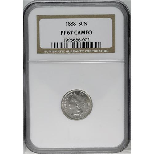 <B>1888<3CN> PR67 Cameo NGC.</B></I> Highly lustrous devices are framed by deeply reflective fields giving this Gem proof an exceptional Cameo appearance. It is sharply struck and lacks toning on either side. Census: 7 in 67, 0 finer (3/06). <BR><BR><B>Important notice:</B> Heritage usually auctions material at the rate of 200-250 lots per hour. On some occasions eBay Live bid software or the Internet may not be able to keep up with the pace of the auction. We recommend placing a realistic absentee bid now as insurance to avoid disappointment. Occasionally the auctioneer may eliminate or reject an eBay Live bid, and the auctioneer may also reopen a lot after the close of the eBay live bidding (usually because we missed an audience bid), and may reject your bid even if it shows you as the winning bidder. By bidding via eBay Live, you agree that Heritage may award the lot to another bidder at its sole discretion under the circumstances described above or any other reasonable circumstances. Since eBay bids are not shown to us until we open the lot on the floor, we treat those bids just like floor bids. In most cases the floor responds before the eBay bid is presented to us, due to Internet lag time, so for consistency we have made it a policy that floor bids are always considered first over tie eBay live bids. Also please note that all Heritage lots purchased through eBay Live carry a 20% Buyer's Premium. Please make sure you read the Terms and Conditions before you bid. This lot is being auctioned in conjunction with a live floor auction by Heritage Galleries & Auctioneers. All final auction and invoice information will be supplied by Heritage Galleries & Auctioneers, and all other information should be considered preliminary. Lot:838 <BR><BR><B>Winning Notification and Billing:</B> After the FINAL session in this auction is complete, Heritage will send e-mail and snail mail invoices. This process normally takes several days. All final auction and invoice information will be supplied by Heritage Galleries & Auctioneers, and all other information should be considered preliminary. <BR><BR>This auction will be conducted on a live auction floor and over the Internet through eBay Live. If you choose to place an absentee bid, please take a moment to <font color='#0000ff'><u><a href='http://pages.ebay.com/liveauctions/help/before/laabsentee.html'>learn how eBay Live absentee bidding works</a></u></font><font color='#000000'>