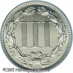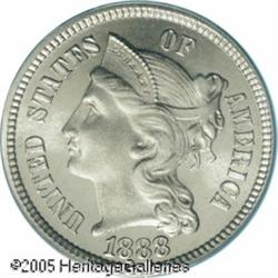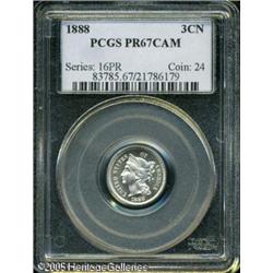 <B>1888 3CN PR67 Cameo PCGS.</B></I> Exceptional Cameo contrast is displayed by the frosty snow-white devices and the glittering, flashy fields. A penultimate proof issue, always available with relatively dull mirrors but infrequently found with such outstanding eye appeal. A pristine specimen, worthy of the finest quality Registry Set. Population: 4 in 67, none finer at either service (1/05). Lot:5833