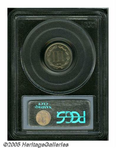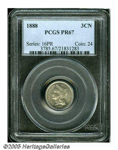 <B>1888<3CN> PR67 PCGS.</B></I> Honey and pearl-gray colors enrich this needle-sharp and immaculate Superb Gem. Satin luster provides pleasing eye appeal. An exceptional specimen of this penultimate issue. Population: 19 in 67, 1 finer (4/05).