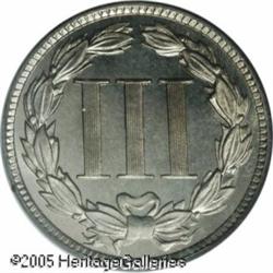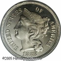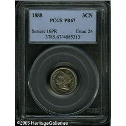 <B>1888 3CN PR67 PCGS.</B></I> This is a Superb Gem Proof with deeply mirrored fields and lustrous devices, presenting light cameo contrast on both sides. The surfaces are highlighted by wisps of pale gold toning. PCGS has only ever certified one finer example of the date. Population: 18 in 67, 1 finer (1/05). Lot:5832