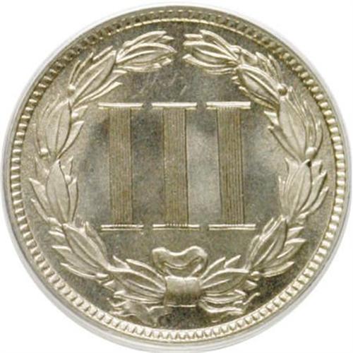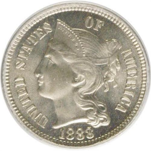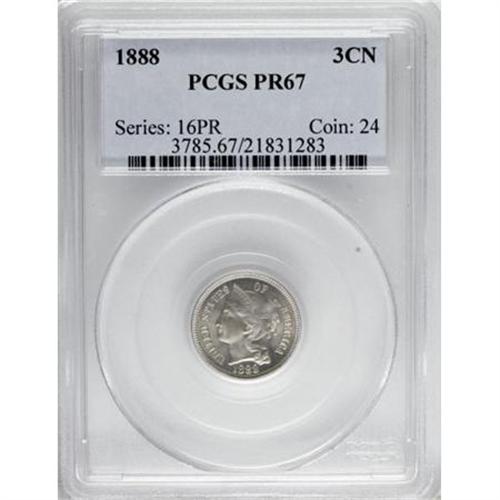 <B>1888 3CN PR67 PCGS.</B></I> PCGS Population (18/1). NGC Census: (16/0). Mintage: 4,582. Numismedia Wsl. Price for NGC/PCGS coin in PR67: $1,100. (#3785)<BR><BR><B>Coin Engraver:</B> James B. Longacre<BR><BR><b>Shipping:</b> Coins & Currency (<a target="_blank" href="http://www.heritageauctions.com/common/shipping.php">view shipping information</a>\)