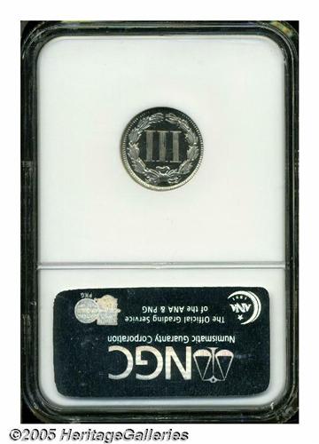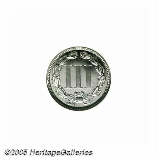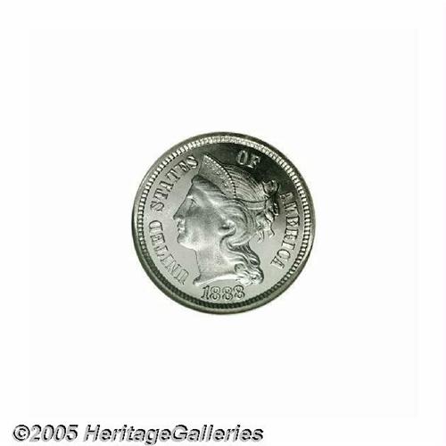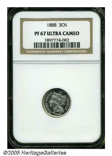 <B>1888<3CN> PR67 Ultra Cameo NGC.</B></I> Fully brilliant and highly attractive with amazing contrast. The devices have exceptional luster and the fields are deeply mirrored. Tiny raised die "artifacts" are seen within the lower loop of the middle 8 in the date, although they do not appear to represent recutting of the digit. NGC has assigned the Ultra Cameo designation to four examples of this date, and this one is the finest. Population: 1 in PR67 Cameo, 0 finer (5/05).