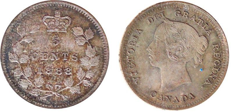 1888 5¢ ICCS Gem Mint State-65 Intense toning over full underlying lustre.