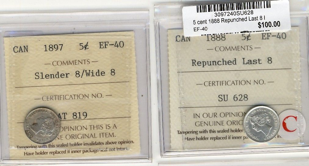 1888 5¢ Repunched Last 8 & 1897 Slender 8/Wide 8 ICCS EF40. Lot of 2 varieties.