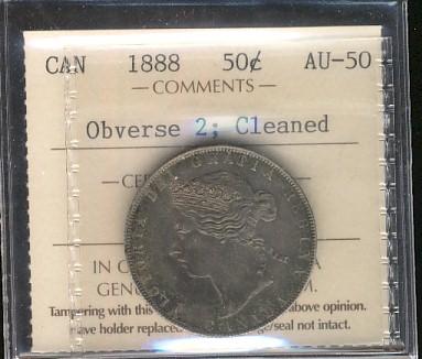 1888 50¢ Obv 2 ICCS AU50. Designated as cleaned. Dark toning with lustre showing through the tones. Should be viewed.