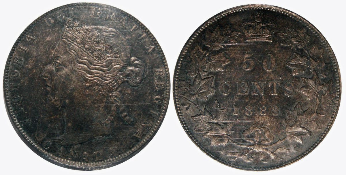 1888 50¢ Obv. 3 ICCS AU55. Intense green and blueish toning with underlying lustre and strong details.