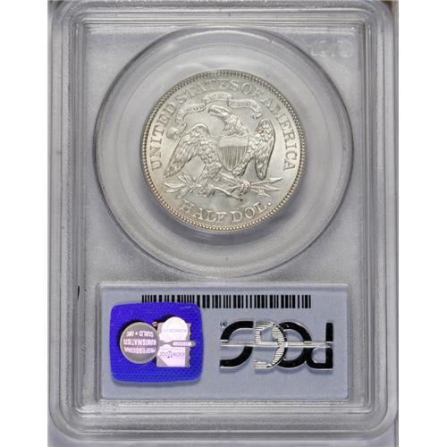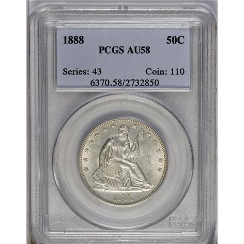 <B>1888<50C> AU58 PCGS.</B></I> Well struck with essentially full luster and bright silver fields, and trace amounts of golden-yellow color at the rims. Clash marks appear near the elbow of the arm holding the staff and cap. Faint hairlines occur in the fields. Minimally abraded and premium quality for the near-Mint grade level.