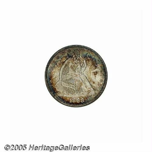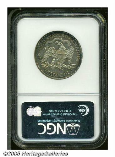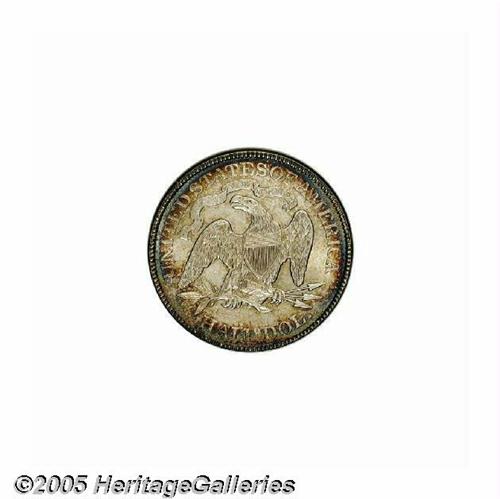 <B>1888<50C> MS65 NGC.</B></I> Only 12,001 business strikes were produced of this important half dollar from the low mintage decade of the 1880s. Few are known today in such well preserved condition as this piece. As with most of the halves from this decade the fields are glittering and somewhat prooflike. In the past less-than-expert collectors and dealers have experienced difficulty telling the difference between business strikes and proofs because of the highly reflective nature of the fields on the low production business strikes. This coin retains some of the original brilliance in the centers with scattered purple, russet, and cobalt-blue toning around the margins. Just a bit softly struck on Liberty's head and the upper stars on the obverse. Population: 11 in 65, 17 finer (6/05).