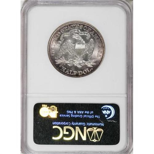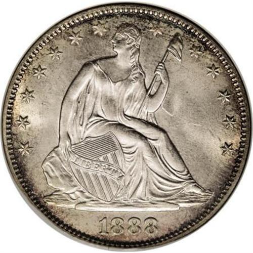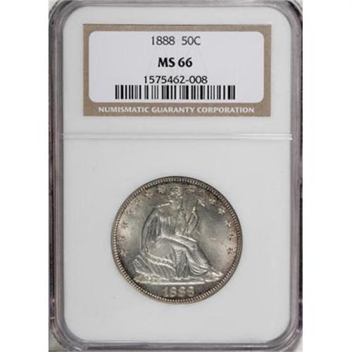 <B>1888 50C MS66 NGC.</B></I> Boldly struck with gorgeous mint frost radiating from both sides. Speckled plum and cobalt-blue patina adorns the peripheries, leaving the centers essentially untoned. Clash marks are noted on each side, but are not distracting. Well preserved and free of abrasions. Census: 13 in 66, 9 finer (6/07). <BR><BR><B>Coin Engraver:</B> Christian Gobrecht<BR><BR><b>Shipping:</b> Coins & Currency (<a target="_blank" href="http://www.heritageauctions.com/common/shipping.php">view shipping information</a>\)