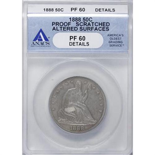 <B>1888 50C --Altered Surfaces, Scratched--ANACS PR60 Details.</B></I> NGC Census: (3/151). PCGS Population (8/159). Mintage: 832. Numismedia Wsl. Price for NGC/PCGS coin in PR60: $400. (#6449)<BR><BR><B>Coin Engraver:</B> Christian Gobrecht<BR><BR><b>Shipping:</b> Coins & Currency (<a target="_blank" href="http://www.heritageauctions.com/common/shipping.php">view shipping information</a>)