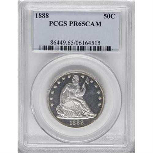 <B>1888 50C PR65 Cameo PCGS.</B></I> Exciting cameo contrast is noted on both sides of this Cameo Gem. The centers are very nearly untoned while some light cinnamon coloration clings to the rims. The fields are nearly free of toning, providing stark black and white contrast. A bold strike defines each detail and consistent with the Gem grade, there is nary a mark worthy of individual mention. Population: 9 in 65 Cameo with a sole example certified finer in Cameo (11/07).<BR><I>From The Kallenberg #1 PCGS Registry Set Of Proof Half Dollars.</B></I><BR><BR><b>Shipping:</b> Coins & Currency (<a target="_blank" href="http://www.heritageauctions.com/common/shipping.php">view shipping information</a>)
