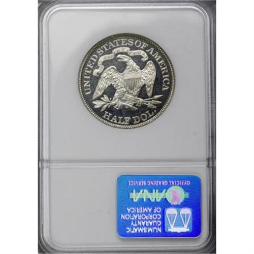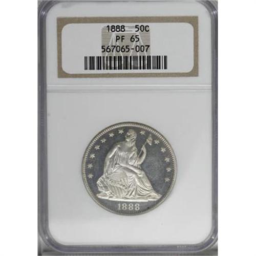 <B>1888 50C PR65 NGC.</B></I> The devices and legends on both sides are icy, but the small hologram NGC holder precedes the Cameo designation for Seated proofs. This sharply struck and impressively preserved Gem has obvious eye appeal, and is one of only 832 proofs struck. Census: 22 in 65, 18 finer (10/07).<BR><I>From The Fleur Wales-Baillie Collection.</B></I><BR><BR><B>Coin Engraver:</B> Christian Gobrecht<BR><BR><b>Shipping:</b> Coins & Currency (<a target="_blank" href="http://www.heritageauctions.com/common/shipping.php">view shipping information</a>)