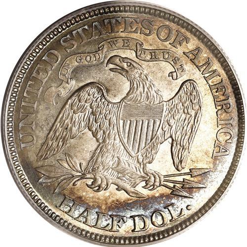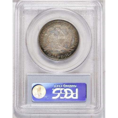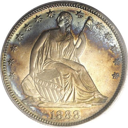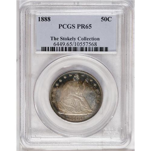 <B>1888<50C> PR65 PCGS.</B></I> Golden-brown fields are bounded by sky-blue and plum tones. This sharply struck Gem is refreshingly clean, and is ideal for a high quality toned silver proof type set. Proofs and business strikes combined for fewer than 13,000 pieces. Population: 16 in 65, 12 finer (6/06).<BR><I>From The Stephen Stokely #1 PCGS Registry Set of Proof Seated Half Dollars.</B></I>
