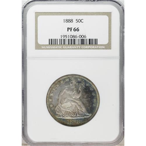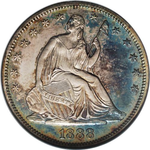 <B>1888 50C PR66 NGC.</B></I> Crystal-sharp striking details and a plethora of intermingled colors are evident on the two sides of this splendid Premium Gem. Electric-green, purple, rose-gray, and amber-gold are the most prominently displayed hues. Neither side exhibits any bothersome hairlines or contact marks.<BR><BR><b>Shipping:</b> Coins & Currency (<a target="_blank" href="http://www.heritageauctions.com/common/shipping.php">view shipping information</a>)