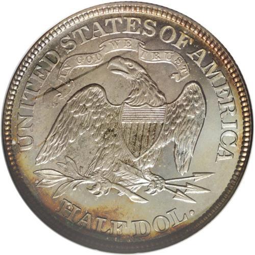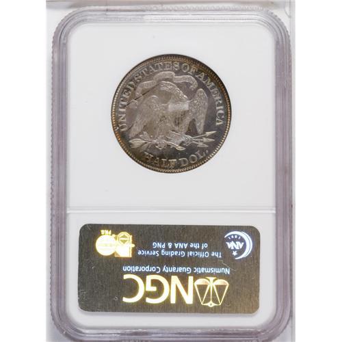 <B>1888<50C> PR67 NGC.</B></I> Instantly appealing but with an unusual color palette, as lilac, ice-blue, and sunset-orange predominate in concentric rings. The mirrored fields on the reverse on their own would merit a Cameo designation; not so the obverse. Robustly struck, extremely appealing, and nearly distraction-free. A long, completely straight pinscratch can be seen on the obverse running from between stars 5 and 6 to star 13. This pinscratch can only be seen when the coin is rotated under a light at just the right angle, but it is mentioned for accuracy only, and it in on way detracts from the huge appeal. Census: 5 in 67, 1 finer (7/06).