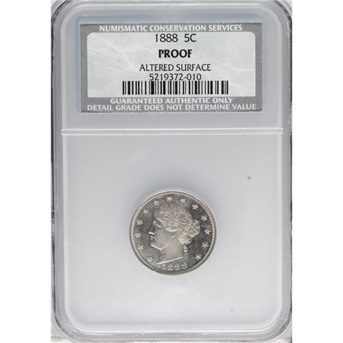<B>1888 5C --Altered Surfaces--NCS. Proof.</B></I> NGC Census: (0/0). PCGS Population (0/0). Mintage: 4,582. (#3886)<BR><BR><b>Shipping:</b> Coins & Currency (<a target="_blank" href="http://www.heritageauctions.com/common/shipping.php">view shipping information</a>)