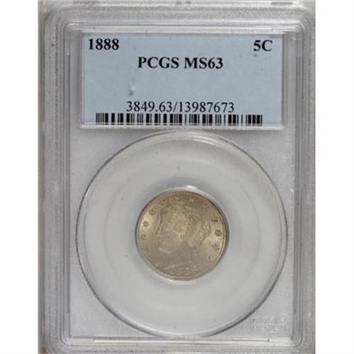 <B>1888 5C MS63 PCGS.</B></I> PCGS Population (91/153). NGC Census: (51/150). Mintage: 10,720,483. Numismedia Wsl. Price for NGC/PCGS coin in MS63: $292. (#3849)<BR><BR><B>Coin Engraver:</B> Charles E. Barber<BR><BR><b>Shipping:</b> Coins & Currency (<a target="_blank" href="http://www.heritageauctions.com/common/shipping.php">view shipping information</a>)