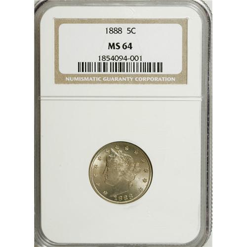 <B>1888 5C MS64 NGC.</B></I> NGC Census: (93/56). PCGS Population (97/49). Mintage: 10,720,483. Numismedia Wsl. Price: $424. (#3849)<BR><BR><b>Shipping:</b> Coins & Currency (<a target="_blank" href="http://www.heritageauctions.com/common/shipping.php">view shipping information</a>)