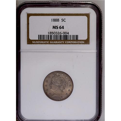 <B>1888<5C> MS64 NGC.</B></I> Softly struck on obverse stars 6 through 11, on the hair detail above Liberty's forehead, and on the lower left portion of the reverse wreath. Lustrous with pleasing olive and tan coloration, and a single small contact mark noted on Liberty's hair, just below the L in LIBERTY.
