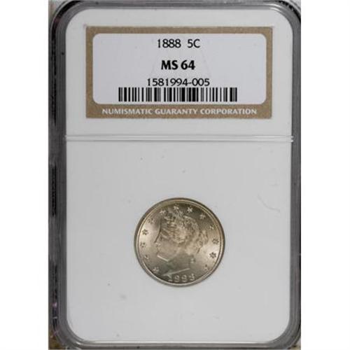 <B>1888 5C MS64 NGC.</B></I> NGC Census: (95/56). PCGS Population (102/50). Mintage: 10,720,483. Numismedia Wsl. Price for NGC/PCGS coin in MS64: $424. (#3849)<BR><BR><B>Coin Engraver:</B> Charles E. Barber<BR><BR><b>Shipping:</b> Coins & Currency (<a target="_blank" href="http://www.heritageauctions.com/common/shipping.php">view shipping information</a>\)
