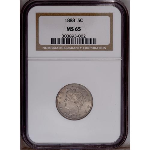<B>1888 5C MS65 NGC.</B></I> Light gray lustrous surfaces are well defined save for typical softness on the left ear of corn. A few small marks on Liberty's neck and cheek correspond to the certified grade. Lightly repunched on the second 8 in the date, and the 1 is connected to the bust by a die break. Census: 46 in 65, 12 finer (1/06).