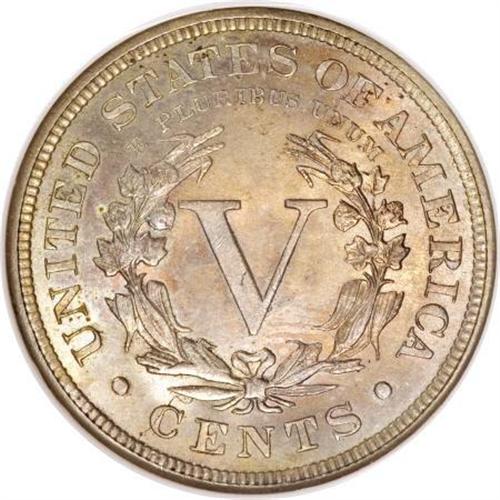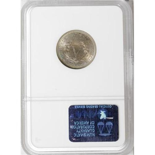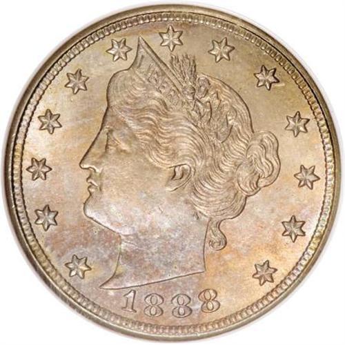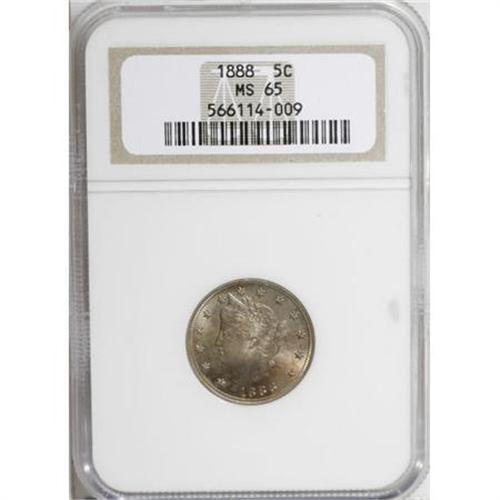 <B>1888 5C MS65 NGC.</B></I> Lustrous surfaces display a melange of medium intensity powder-blue, orange-gold, gray, and lavender patination. Well struck, save for the usual softness on the leaves immediately left of the bowknot. A few grade-consistent marks do not disturb.<BR><BR><B>Coin Engraver:</B> Charles E. Barber<BR><BR><b>Shipping:</b> Coins & Currency (<a target="_blank" href="http://www.heritageauctions.com/common/shipping.php">view shipping information</a>)