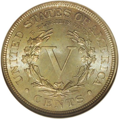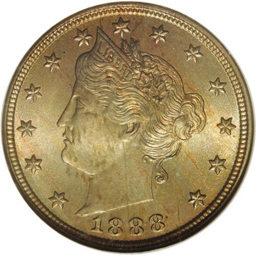 <B>1888<5C> MS66 NGC.</B></I> This amazing example is tied with a small number of similar examples for honors as the finest certified business strike of the date. Both sides have exceptionally sharp design definition, including full hair and star details on the obverse, and complete wreath details on the reverse. Even the small ear of corn in the lower part of the left branch of the wreath is fully defined. The surfaces are exceptional for their quality and preservation, with fully lustrous mint frost beneath delightful gold and iridescent toning, with additional bluish color on the reverse. Census: 12 in 66, 0 finer (4/06).