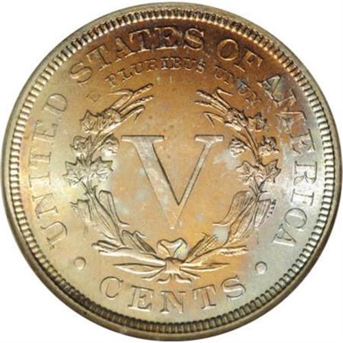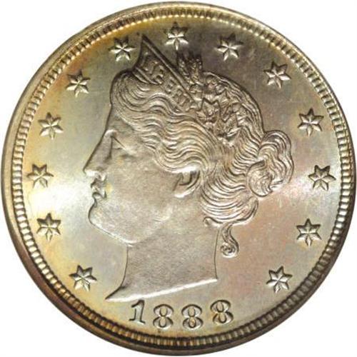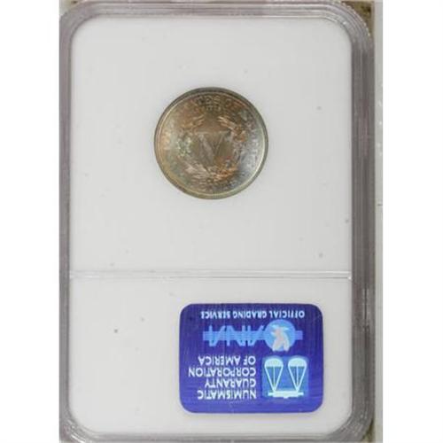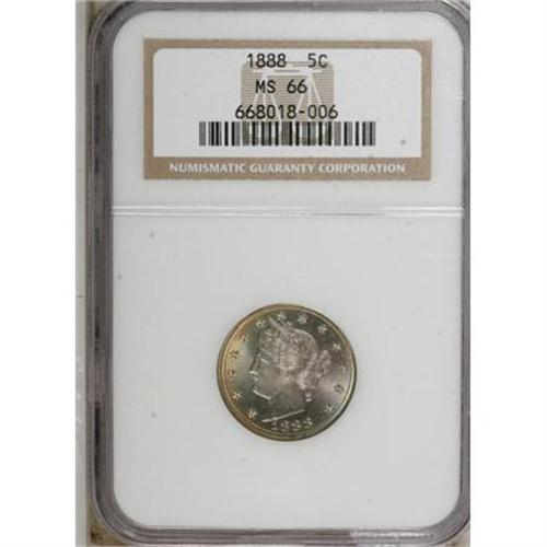 <B>1888 5C MS66 NGC.</B></I> Beautiful lemon, ice-blue, salmon-pink, peach, and lime-green shades alternate across this lustrous and precisely struck Premium Gem. Marks are essentially absent, and the eye appeal is unsurpassable. The 1888 has a lower mintage than the majority of dates. Census: 12 in 66, 0 finer (11/07).<BR><BR><B>Coin Engraver:</B> Charles E. Barber<BR><BR><b>Shipping:</b> Coins & Currency (<a target="_blank" href="http://www.heritageauctions.com/common/shipping.php">view shipping information</a>)