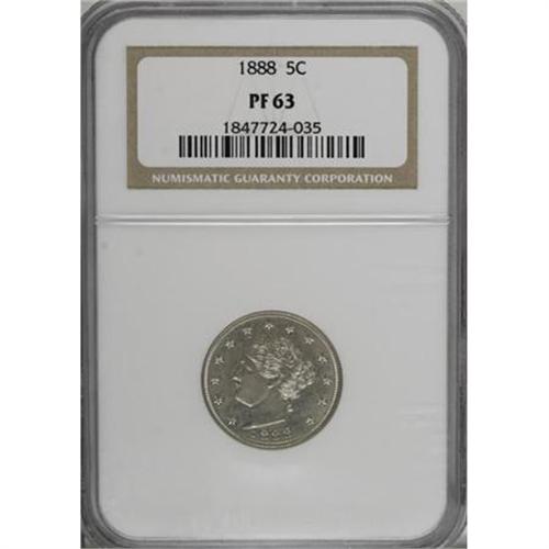 <B>1888 5C PR63 NGC.</B></I> NGC Census: (63/582). PCGS Population (119/569). Mintage: 4,582. Numismedia Wsl. Price for NGC/PCGS coin in PR63: $200. (#3886)<BR><BR><B>Coin Engraver:</B> Charles E. Barber<BR><BR><b>Shipping:</b> Coins & Currency (<a target="_blank" href="http://www.heritageauctions.com/common/shipping.php">view shipping information</a>)