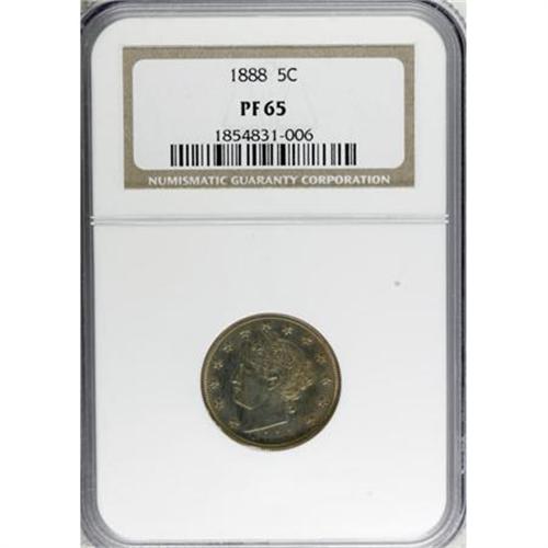 <B>1888 5C PR65 NGC.</B></I> NGC Census: (234/96). PCGS Population (169/69). Mintage: 4,582. Numismedia Wsl. Price for NGC/PCGS coin in PR65: $500. (#3886)<BR><BR><B>Coin Engraver:</B> Charles E. Barber<BR><BR><b>Shipping:</b> Coins & Currency (<a target="_blank" href="http://www.heritageauctions.com/common/shipping.php">view shipping information</a>\)