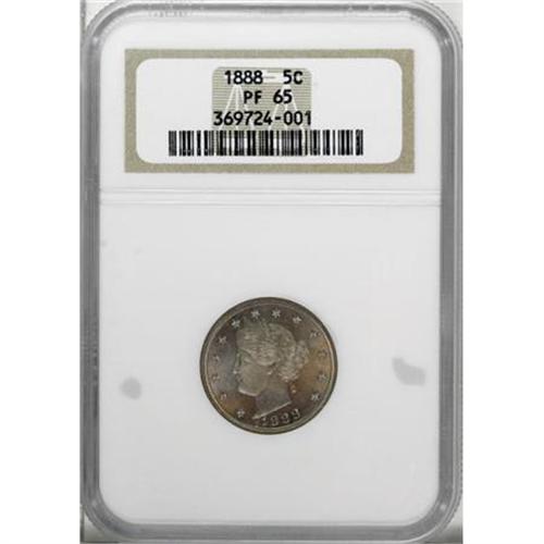 <B>1888 5C PR65 NGC.</B></I> NGC Census: (238/97). PCGS Population (173/70). Mintage: 4,582. Numismedia Wsl. Price for NGC/PCGS coin in PR65: $500. (#3886)<BR><BR><B>Coin Engraver:</B> Charles E. Barber<BR><BR><b>Shipping:</b> Coins & Currency (<a target="_blank" href="http://www.heritageauctions.com/common/shipping.php">view shipping information</a>)